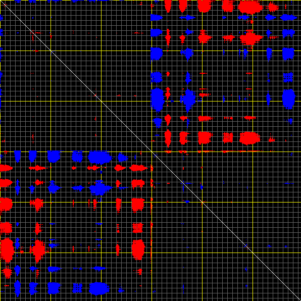 This matrix displays the maximum distance fluctuations between all pairs of CA atoms and between the two extreme conformations that were computed for this mode (DQMIN/DQMAX). Distance increases are plotted in blue and decreases in red for the strongest 10% of the residue pair distance changes. Every pixel corresponds to a single residue. Grey lines are drawn every 10 residues, yellow lines every 100 residues (counting from the upper left corner).