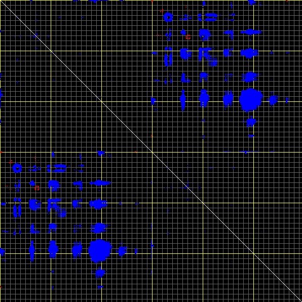This matrix displays the maximum distance fluctuations between all pairs of CA atoms and between the two extreme conformations that were computed for this mode (DQMIN/DQMAX). Distance increases are plotted in blue and decreases in red for the strongest 10% of the residue pair distance changes. Every pixel corresponds to a single residue. Grey lines are drawn every 10 residues, yellow lines every 100 residues (counting from the upper left corner).