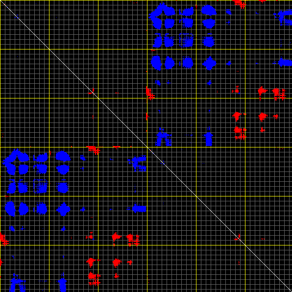 This matrix displays the maximum distance fluctuations between all pairs of CA atoms and between the two extreme conformations that were computed for this mode (DQMIN/DQMAX). Distance increases are plotted in blue and decreases in red for the strongest 10% of the residue pair distance changes. Every pixel corresponds to a single residue. Grey lines are drawn every 10 residues, yellow lines every 100 residues (counting from the upper left corner).