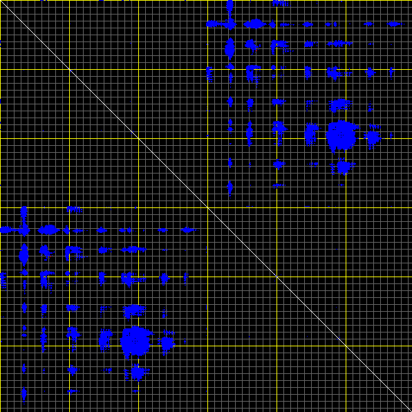 This matrix displays the maximum distance fluctuations between all pairs of CA atoms and between the two extreme conformations that were computed for this mode (DQMIN/DQMAX). Distance increases are plotted in blue and decreases in red for the strongest 10% of the residue pair distance changes. Every pixel corresponds to a single residue. Grey lines are drawn every 10 residues, yellow lines every 100 residues (counting from the upper left corner).