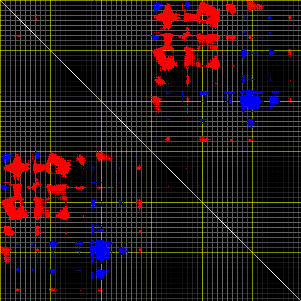 This matrix displays the maximum distance fluctuations between all pairs of CA atoms and between the two extreme conformations that were computed for this mode (DQMIN/DQMAX). Distance increases are plotted in blue and decreases in red for the strongest 10% of the residue pair distance changes. Every pixel corresponds to a single residue. Grey lines are drawn every 10 residues, yellow lines every 100 residues (counting from the upper left corner).