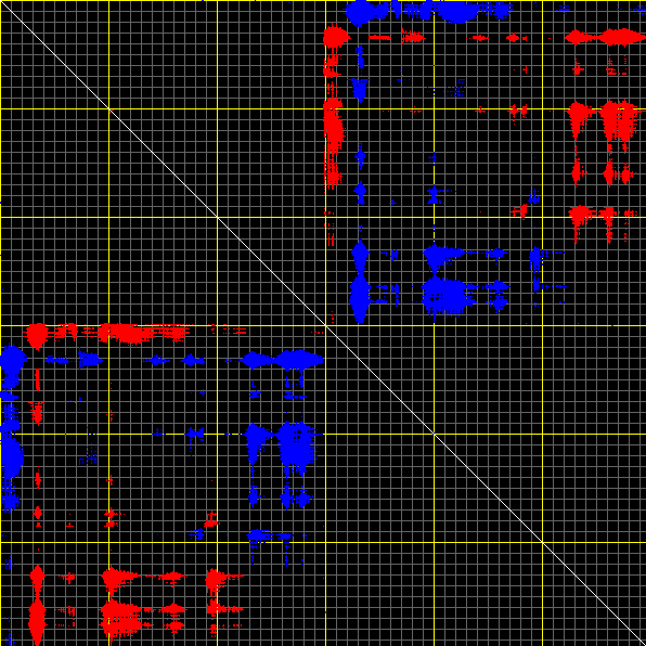 This matrix displays the maximum distance fluctuations between all pairs of CA atoms and between the two extreme conformations that were computed for this mode (DQMIN/DQMAX). Distance increases are plotted in blue and decreases in red for the strongest 10% of the residue pair distance changes. Every pixel corresponds to a single residue. Grey lines are drawn every 10 residues, yellow lines every 100 residues (counting from the upper left corner).