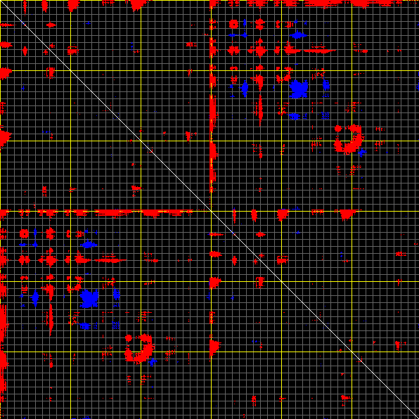 This matrix displays the maximum distance fluctuations between all pairs of CA atoms and between the two extreme conformations that were computed for this mode (DQMIN/DQMAX). Distance increases are plotted in blue and decreases in red for the strongest 10% of the residue pair distance changes. Every pixel corresponds to a single residue. Grey lines are drawn every 10 residues, yellow lines every 100 residues (counting from the upper left corner).