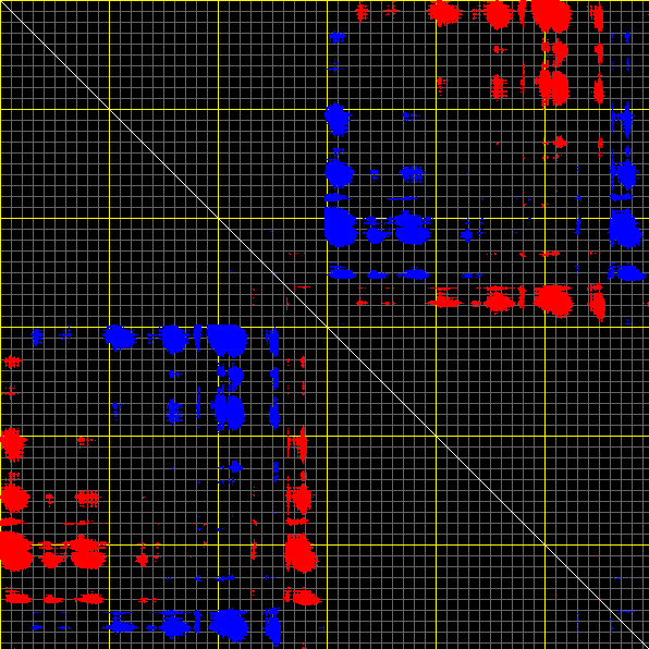 This matrix displays the maximum distance fluctuations between all pairs of CA atoms and between the two extreme conformations that were computed for this mode (DQMIN/DQMAX). Distance increases are plotted in blue and decreases in red for the strongest 10% of the residue pair distance changes. Every pixel corresponds to a single residue. Grey lines are drawn every 10 residues, yellow lines every 100 residues (counting from the upper left corner).