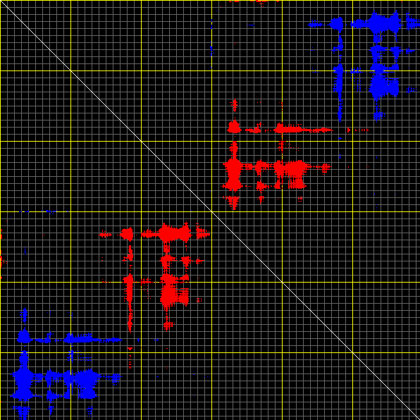 This matrix displays the maximum distance fluctuations between all pairs of CA atoms and between the two extreme conformations that were computed for this mode (DQMIN/DQMAX). Distance increases are plotted in blue and decreases in red for the strongest 10% of the residue pair distance changes. Every pixel corresponds to a single residue. Grey lines are drawn every 10 residues, yellow lines every 100 residues (counting from the upper left corner).