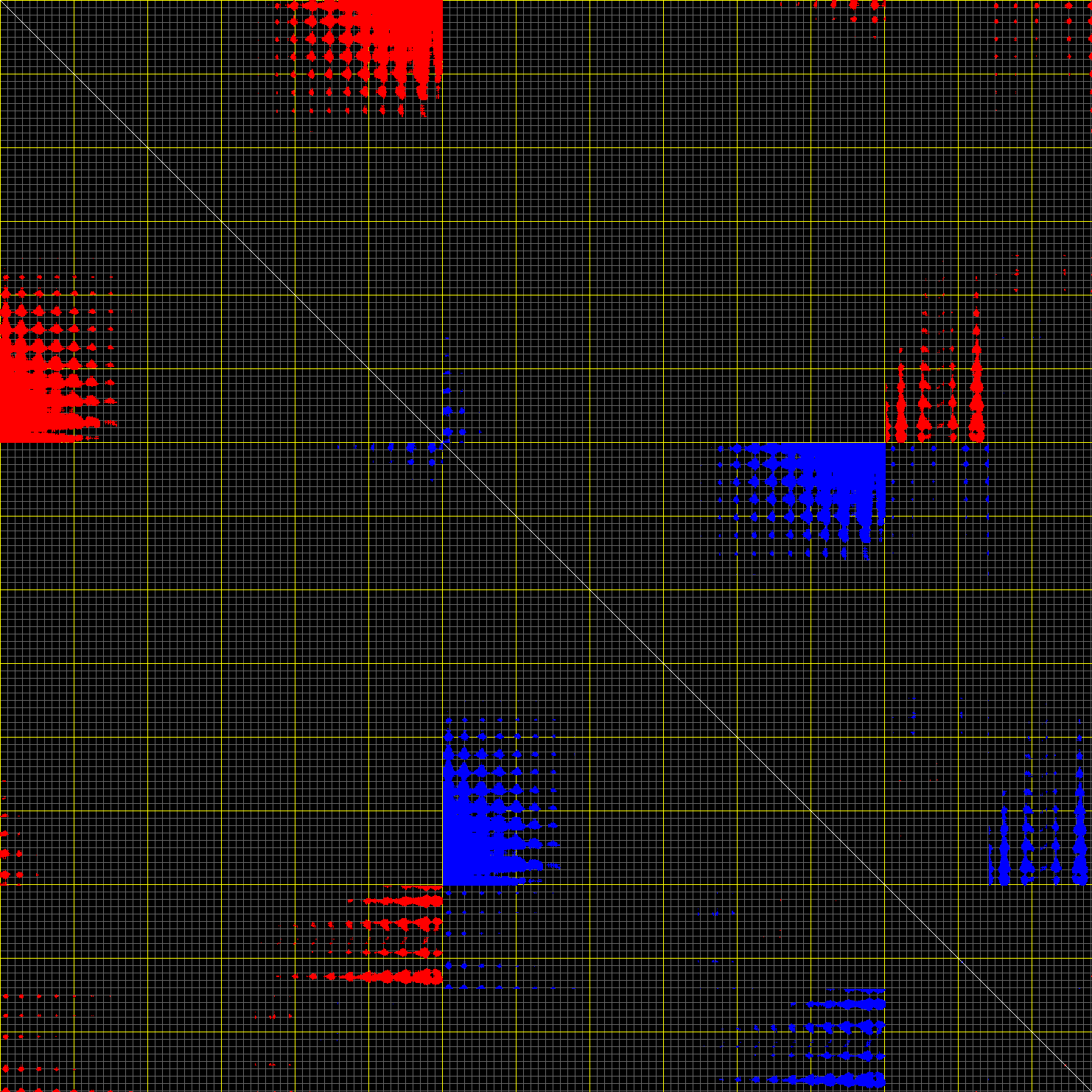 This matrix displays the maximum distance fluctuations between all pairs of CA atoms and between the two extreme conformations that were computed for this mode (DQMIN/DQMAX). Distance increases are plotted in blue and decreases in red for the strongest 10% of the residue pair distance changes. Every pixel corresponds to a single residue. Grey lines are drawn every 10 residues, yellow lines every 100 residues (counting from the upper left corner).