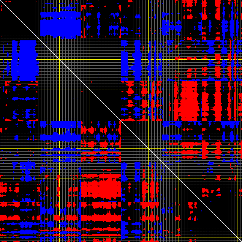 This matrix displays the maximum distance fluctuations between all pairs of CA atoms and between the two extreme conformations that were computed for this mode (DQMIN/DQMAX). Distance increases are plotted in blue and decreases in red for the strongest 10% of the residue pair distance changes. Every pixel corresponds to a single residue. Grey lines are drawn every 10 residues, yellow lines every 100 residues (counting from the upper left corner).