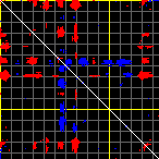 This matrix displays the maximum distance fluctuations between all pairs of CA atoms and between the two extreme conformations that were computed for this mode (DQMIN/DQMAX). Distance increases are plotted in blue and decreases in red for the strongest 10% of the residue pair distance changes. Every pixel corresponds to a single residue. Grey lines are drawn every 10 residues, yellow lines every 100 residues (counting from the upper left corner).