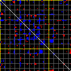 This matrix displays the maximum distance fluctuations between all pairs of CA atoms and between the two extreme conformations that were computed for this mode (DQMIN/DQMAX). Distance increases are plotted in blue and decreases in red for the strongest 10% of the residue pair distance changes. Every pixel corresponds to a single residue. Grey lines are drawn every 10 residues, yellow lines every 100 residues (counting from the upper left corner).