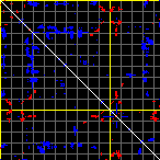 This matrix displays the maximum distance fluctuations between all pairs of CA atoms and between the two extreme conformations that were computed for this mode (DQMIN/DQMAX). Distance increases are plotted in blue and decreases in red for the strongest 10% of the residue pair distance changes. Every pixel corresponds to a single residue. Grey lines are drawn every 10 residues, yellow lines every 100 residues (counting from the upper left corner).