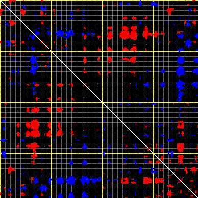 This matrix displays the maximum distance fluctuations between all pairs of CA atoms and between the two extreme conformations that were computed for this mode (DQMIN/DQMAX). Distance increases are plotted in blue and decreases in red for the strongest 10% of the residue pair distance changes. Every pixel corresponds to a single residue. Grey lines are drawn every 10 residues, yellow lines every 100 residues (counting from the upper left corner).