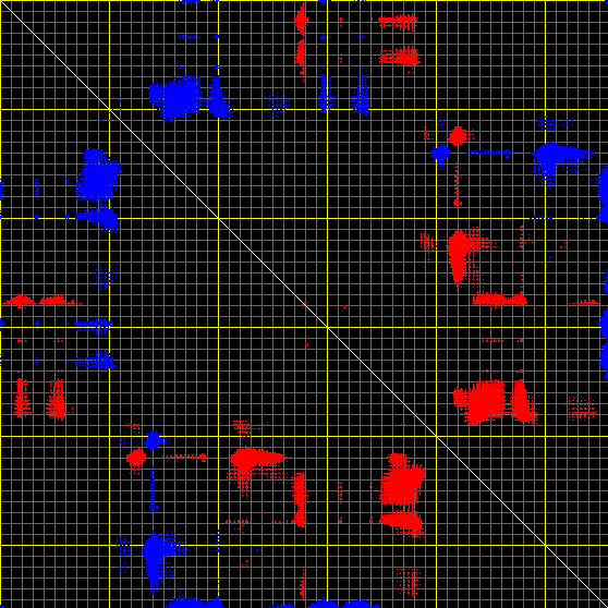 This matrix displays the maximum distance fluctuations between all pairs of CA atoms and between the two extreme conformations that were computed for this mode (DQMIN/DQMAX). Distance increases are plotted in blue and decreases in red for the strongest 10% of the residue pair distance changes. Every pixel corresponds to a single residue. Grey lines are drawn every 10 residues, yellow lines every 100 residues (counting from the upper left corner).