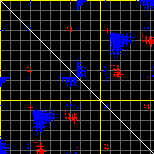 This matrix displays the maximum distance fluctuations between all pairs of CA atoms and between the two extreme conformations that were computed for this mode (DQMIN/DQMAX). Distance increases are plotted in blue and decreases in red for the strongest 10% of the residue pair distance changes. Every pixel corresponds to a single residue. Grey lines are drawn every 10 residues, yellow lines every 100 residues (counting from the upper left corner).