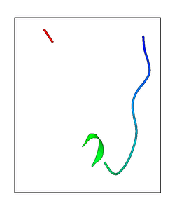 CAUTION: The amplitude range presented in these views corresponds to the highest (DQMAX) and lowest (DQMIN) perturbations chosen for this mode. Secondary structures can break down (and thus disappear from the animation) if the applied amplitudes are too large for Molscript to identify them. The choice of the amplitude is not a NMA result, but has to be done by the user on physical grounds. To change the amplitude range, you can recompute the animation of the desired mode by using the "Compute additional perturbed models with elNémo" section on the results page of your job.
