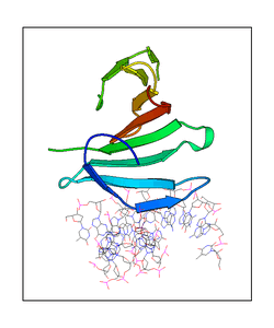 These views are prepared from three orthologuous viewpoints with MolScript. Secondary structures are determined from the C-alpha atom positions of your protein (N-terminal blue, C-terminal red).