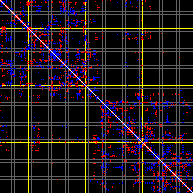 This matrix displays the maximum distance fluctuations between all pairs of CA atoms and between the two extreme conformations that were computed for this mode (DQMIN/DQMAX). Distance increases are plotted in blue and decreases in red for the strongest 10% of the residue pair distance changes. Every pixel corresponds to a single residue. Grey lines are drawn every 10 residues, yellow lines every 100 residues (counting from the upper left corner).