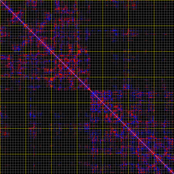 This matrix displays the maximum distance fluctuations between all pairs of CA atoms and between the two extreme conformations that were computed for this mode (DQMIN/DQMAX). Distance increases are plotted in blue and decreases in red for the strongest 10% of the residue pair distance changes. Every pixel corresponds to a single residue. Grey lines are drawn every 10 residues, yellow lines every 100 residues (counting from the upper left corner).