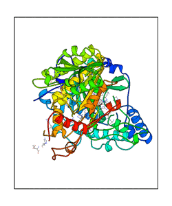 These views are prepared from three orthologuous viewpoints with MolScript. Secondary structures are determined from the C-alpha atom positions of your protein (N-terminal blue, C-terminal red).