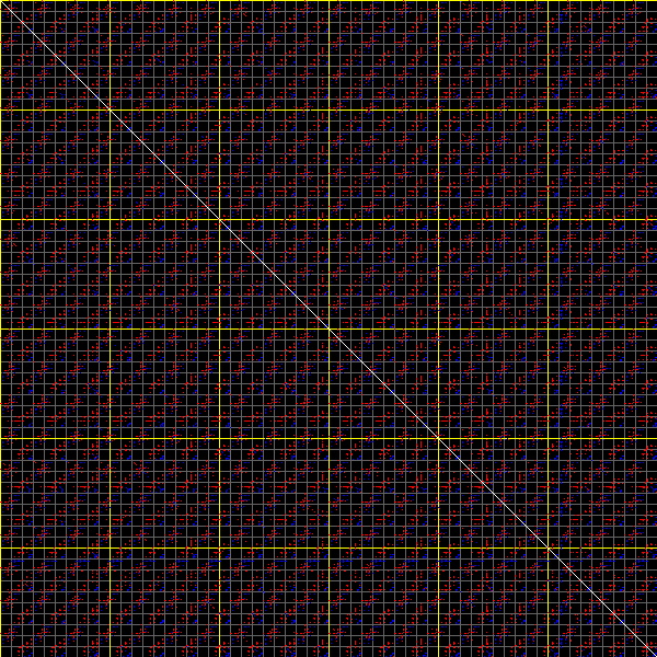 This matrix displays the maximum distance fluctuations between all pairs of CA atoms and between the two extreme conformations that were computed for this mode (DQMIN/DQMAX). Distance increases are plotted in blue and decreases in red for the strongest 10% of the residue pair distance changes. Every pixel corresponds to a single residue. Grey lines are drawn every 10 residues, yellow lines every 100 residues (counting from the upper left corner).