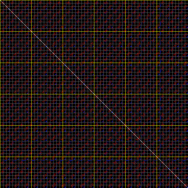 This matrix displays the maximum distance fluctuations between all pairs of CA atoms and between the two extreme conformations that were computed for this mode (DQMIN/DQMAX). Distance increases are plotted in blue and decreases in red for the strongest 10% of the residue pair distance changes. Every pixel corresponds to a single residue. Grey lines are drawn every 10 residues, yellow lines every 100 residues (counting from the upper left corner).