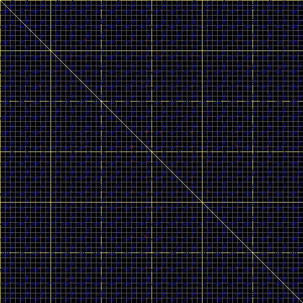 This matrix displays the maximum distance fluctuations between all pairs of CA atoms and between the two extreme conformations that were computed for this mode (DQMIN/DQMAX). Distance increases are plotted in blue and decreases in red for the strongest 10% of the residue pair distance changes. Every pixel corresponds to a single residue. Grey lines are drawn every 10 residues, yellow lines every 100 residues (counting from the upper left corner).