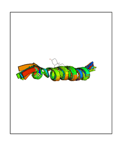 CAUTION: The amplitude range presented in these views corresponds to the highest (DQMAX) and lowest (DQMIN) perturbations chosen for this mode. Secondary structures can break down (and thus disappear from the animation) if the applied amplitudes are too large for Molscript to identify them. The choice of the amplitude is not a NMA result, but has to be done by the user on physical grounds. To change the amplitude range, you can recompute the animation of the desired mode by using the "Compute additional perturbed models with elNémo" section on the results page of your job.