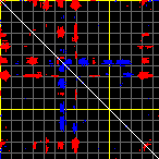 This matrix displays the maximum distance fluctuations between all pairs of CA atoms and between the two extreme conformations that were computed for this mode (DQMIN/DQMAX). Distance increases are plotted in blue and decreases in red for the strongest 10% of the residue pair distance changes. Every pixel corresponds to a single residue. Grey lines are drawn every 10 residues, yellow lines every 100 residues (counting from the upper left corner).