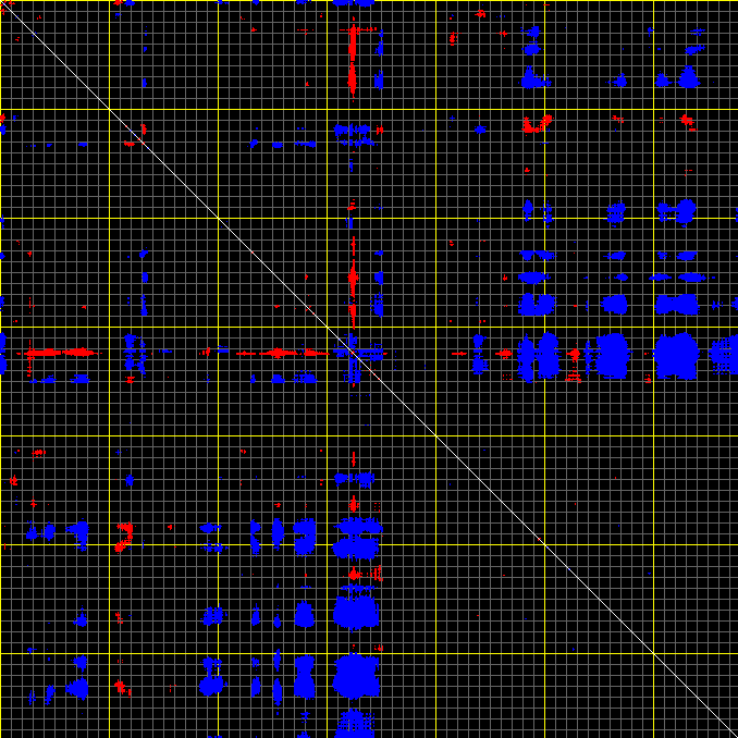 This matrix displays the maximum distance fluctuations between all pairs of CA atoms and between the two extreme conformations that were computed for this mode (DQMIN/DQMAX). Distance increases are plotted in blue and decreases in red for the strongest 10% of the residue pair distance changes. Every pixel corresponds to a single residue. Grey lines are drawn every 10 residues, yellow lines every 100 residues (counting from the upper left corner).