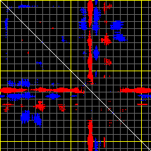 This matrix displays the maximum distance fluctuations between all pairs of CA atoms and between the two extreme conformations that were computed for this mode (DQMIN/DQMAX). Distance increases are plotted in blue and decreases in red for the strongest 10% of the residue pair distance changes. Every pixel corresponds to a single residue. Grey lines are drawn every 10 residues, yellow lines every 100 residues (counting from the upper left corner).