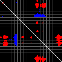 This matrix displays the maximum distance fluctuations between all pairs of CA atoms and between the two extreme conformations that were computed for this mode (DQMIN/DQMAX). Distance increases are plotted in blue and decreases in red for the strongest 10% of the residue pair distance changes. Every pixel corresponds to a single residue. Grey lines are drawn every 10 residues, yellow lines every 100 residues (counting from the upper left corner).