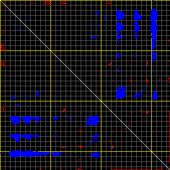 This matrix displays the maximum distance fluctuations between all pairs of CA atoms and between the two extreme conformations that were computed for this mode (DQMIN/DQMAX). Distance increases are plotted in blue and decreases in red for the strongest 10% of the residue pair distance changes. Every pixel corresponds to a single residue. Grey lines are drawn every 10 residues, yellow lines every 100 residues (counting from the upper left corner).