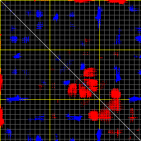 This matrix displays the maximum distance fluctuations between all pairs of CA atoms and between the two extreme conformations that were computed for this mode (DQMIN/DQMAX). Distance increases are plotted in blue and decreases in red for the strongest 10% of the residue pair distance changes. Every pixel corresponds to a single residue. Grey lines are drawn every 10 residues, yellow lines every 100 residues (counting from the upper left corner).