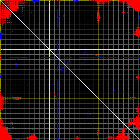 This matrix displays the maximum distance fluctuations between all pairs of CA atoms and between the two extreme conformations that were computed for this mode (DQMIN/DQMAX). Distance increases are plotted in blue and decreases in red for the strongest 10% of the residue pair distance changes. Every pixel corresponds to a single residue. Grey lines are drawn every 10 residues, yellow lines every 100 residues (counting from the upper left corner).