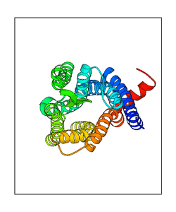These views are prepared from three orthologuous viewpoints with MolScript. Secondary structures are determined from the C-alpha atom positions of your protein (N-terminal blue, C-terminal red).