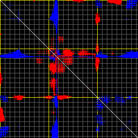 This matrix displays the maximum distance fluctuations between all pairs of CA atoms and between the two extreme conformations that were computed for this mode (DQMIN/DQMAX). Distance increases are plotted in blue and decreases in red for the strongest 10% of the residue pair distance changes. Every pixel corresponds to a single residue. Grey lines are drawn every 10 residues, yellow lines every 100 residues (counting from the upper left corner).
