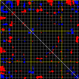 This matrix displays the maximum distance fluctuations between all pairs of CA atoms and between the two extreme conformations that were computed for this mode (DQMIN/DQMAX). Distance increases are plotted in blue and decreases in red for the strongest 10% of the residue pair distance changes. Every pixel corresponds to a single residue. Grey lines are drawn every 10 residues, yellow lines every 100 residues (counting from the upper left corner).