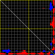 This matrix displays the maximum distance fluctuations between all pairs of CA atoms and between the two extreme conformations that were computed for this mode (DQMIN/DQMAX). Distance increases are plotted in blue and decreases in red for the strongest 10% of the residue pair distance changes. Every pixel corresponds to a single residue. Grey lines are drawn every 10 residues, yellow lines every 100 residues (counting from the upper left corner).