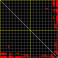 This matrix displays the maximum distance fluctuations between all pairs of CA atoms and between the two extreme conformations that were computed for this mode (DQMIN/DQMAX). Distance increases are plotted in blue and decreases in red for the strongest 10% of the residue pair distance changes. Every pixel corresponds to a single residue. Grey lines are drawn every 10 residues, yellow lines every 100 residues (counting from the upper left corner).