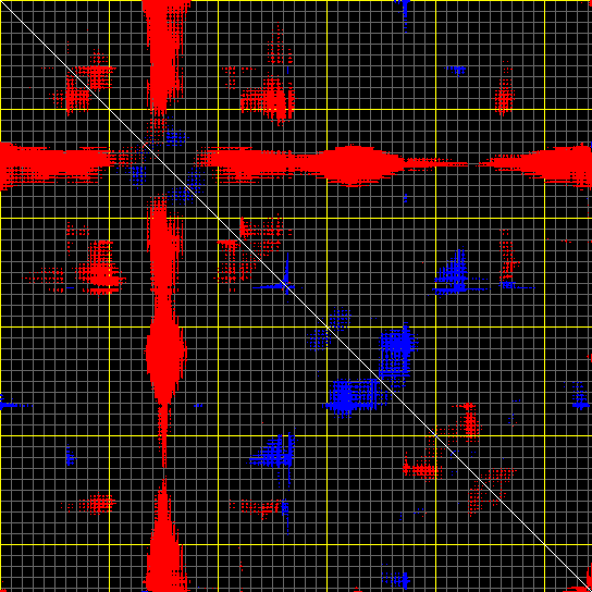 This matrix displays the maximum distance fluctuations between all pairs of CA atoms and between the two extreme conformations that were computed for this mode (DQMIN/DQMAX). Distance increases are plotted in blue and decreases in red for the strongest 10% of the residue pair distance changes. Every pixel corresponds to a single residue. Grey lines are drawn every 10 residues, yellow lines every 100 residues (counting from the upper left corner).