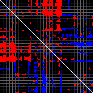 This matrix displays the maximum distance fluctuations between all pairs of CA atoms and between the two extreme conformations that were computed for this mode (DQMIN/DQMAX). Distance increases are plotted in blue and decreases in red for the strongest 10% of the residue pair distance changes. Every pixel corresponds to a single residue. Grey lines are drawn every 10 residues, yellow lines every 100 residues (counting from the upper left corner).
