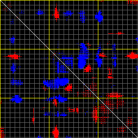 This matrix displays the maximum distance fluctuations between all pairs of CA atoms and between the two extreme conformations that were computed for this mode (DQMIN/DQMAX). Distance increases are plotted in blue and decreases in red for the strongest 10% of the residue pair distance changes. Every pixel corresponds to a single residue. Grey lines are drawn every 10 residues, yellow lines every 100 residues (counting from the upper left corner).