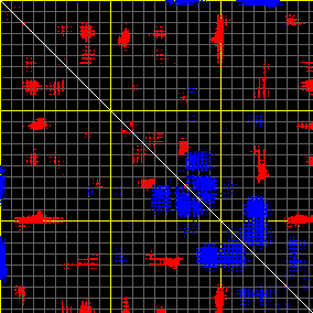 This matrix displays the maximum distance fluctuations between all pairs of CA atoms and between the two extreme conformations that were computed for this mode (DQMIN/DQMAX). Distance increases are plotted in blue and decreases in red for the strongest 10% of the residue pair distance changes. Every pixel corresponds to a single residue. Grey lines are drawn every 10 residues, yellow lines every 100 residues (counting from the upper left corner).