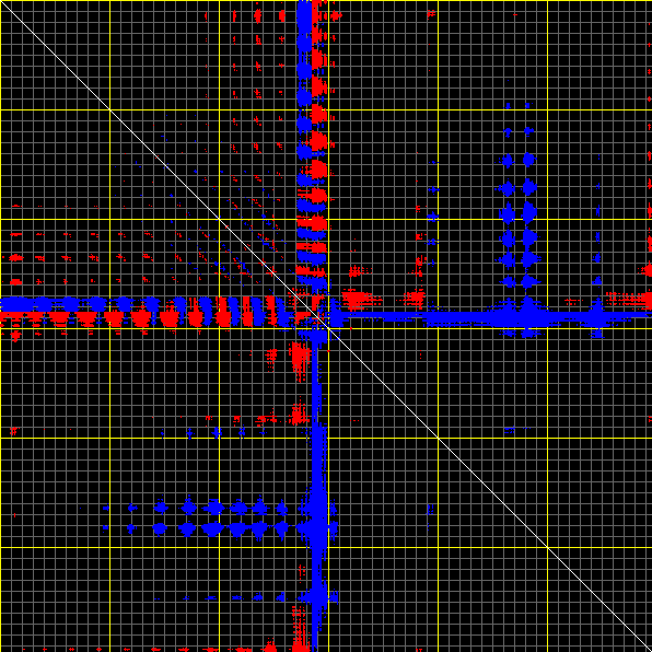 This matrix displays the maximum distance fluctuations between all pairs of CA atoms and between the two extreme conformations that were computed for this mode (DQMIN/DQMAX). Distance increases are plotted in blue and decreases in red for the strongest 10% of the residue pair distance changes. Every pixel corresponds to a single residue. Grey lines are drawn every 10 residues, yellow lines every 100 residues (counting from the upper left corner).