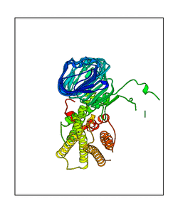 These views are prepared from three orthologuous viewpoints with MolScript. Secondary structures are determined from the C-alpha atom positions of your protein (N-terminal blue, C-terminal red).