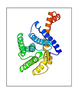 These views are prepared from three orthologuous viewpoints with MolScript. Secondary structures are determined from the C-alpha atom positions of your protein (N-terminal blue, C-terminal red).