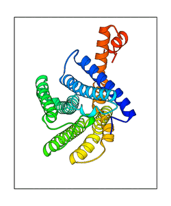 These views are prepared from three orthologuous viewpoints with MolScript. Secondary structures are determined from the C-alpha atom positions of your protein (N-terminal blue, C-terminal red).
