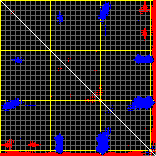 This matrix displays the maximum distance fluctuations between all pairs of CA atoms and between the two extreme conformations that were computed for this mode (DQMIN/DQMAX). Distance increases are plotted in blue and decreases in red for the strongest 10% of the residue pair distance changes. Every pixel corresponds to a single residue. Grey lines are drawn every 10 residues, yellow lines every 100 residues (counting from the upper left corner).