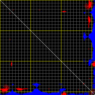 This matrix displays the maximum distance fluctuations between all pairs of CA atoms and between the two extreme conformations that were computed for this mode (DQMIN/DQMAX). Distance increases are plotted in blue and decreases in red for the strongest 10% of the residue pair distance changes. Every pixel corresponds to a single residue. Grey lines are drawn every 10 residues, yellow lines every 100 residues (counting from the upper left corner).