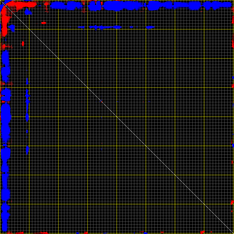 This matrix displays the maximum distance fluctuations between all pairs of CA atoms and between the two extreme conformations that were computed for this mode (DQMIN/DQMAX). Distance increases are plotted in blue and decreases in red for the strongest 10% of the residue pair distance changes. Every pixel corresponds to a single residue. Grey lines are drawn every 10 residues, yellow lines every 100 residues (counting from the upper left corner).