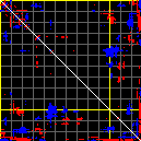 This matrix displays the maximum distance fluctuations between all pairs of CA atoms and between the two extreme conformations that were computed for this mode (DQMIN/DQMAX). Distance increases are plotted in blue and decreases in red for the strongest 10% of the residue pair distance changes. Every pixel corresponds to a single residue. Grey lines are drawn every 10 residues, yellow lines every 100 residues (counting from the upper left corner).